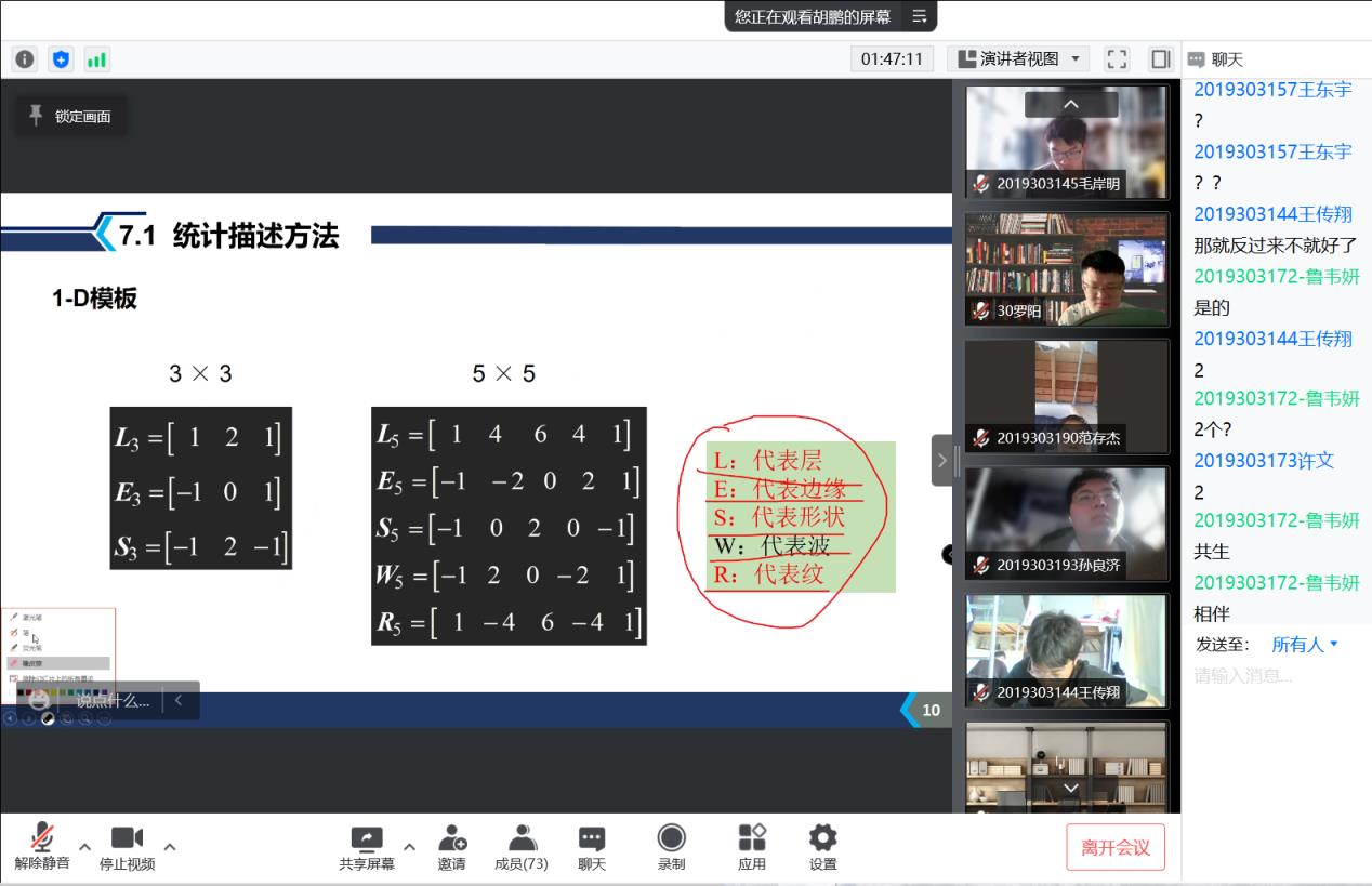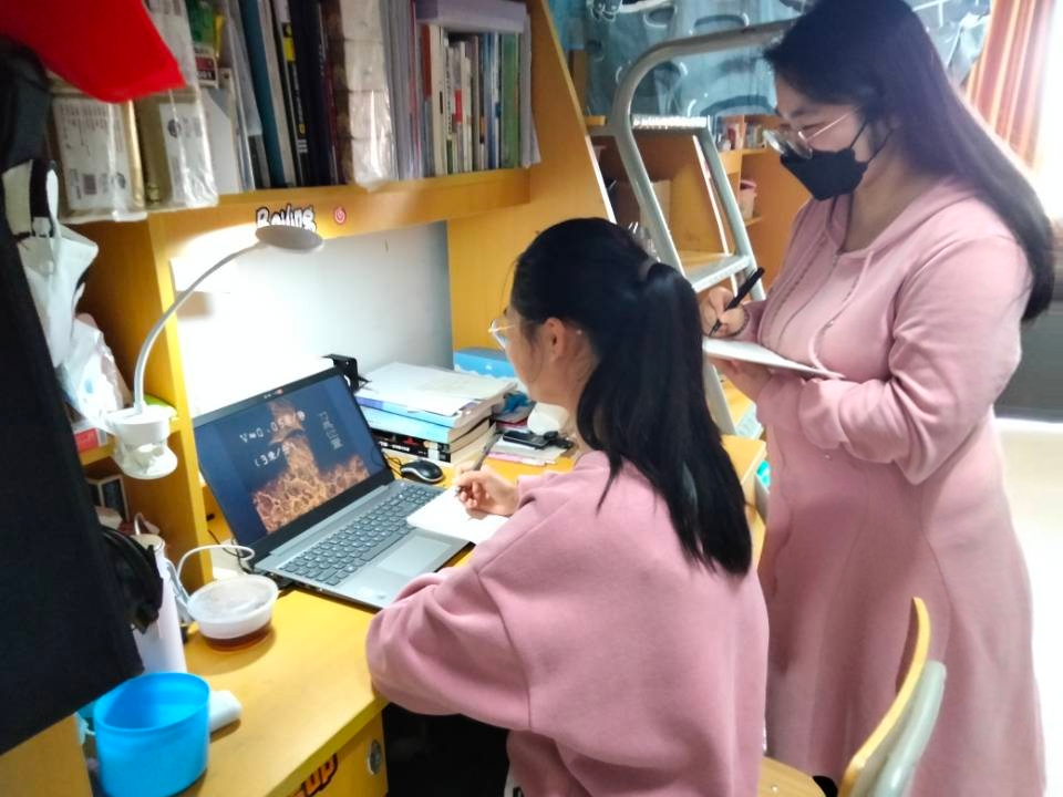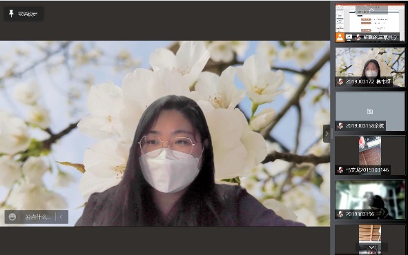 督查工作完毕后,我回到寝室,检查好网络线路,准时进入线上课堂。为了保证线上授课的高效性与趣味性,老师会要求我们开启视频,进行课堂互动。一开始,我对于开视频上课还有一点点不太适应,但我发现这种线上互动开放方式新颖有趣,效果更好,于是我开始在课堂上主动开麦积极和老师互动,给老师实时的反馈。