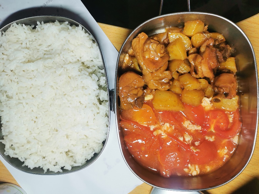 午饭时间到,我戴好口罩,拿上学院给我们每位同学配备的 “铁饭碗”,去爱苑食堂二楼打饭回宿舍用餐。虽然外面疫情形势严峻,我们还处于封控阶段,但是学校物资供应保障一直很充足,食堂打饭窗口的菜品仍然和疫情前一样选择多样。今天,我点了一份西红柿炒鸡蛋和土豆鸡块,菜价稳定,菜品美味,打菜的阿姨也很热情,还特意多给我打了几块鸡肉。