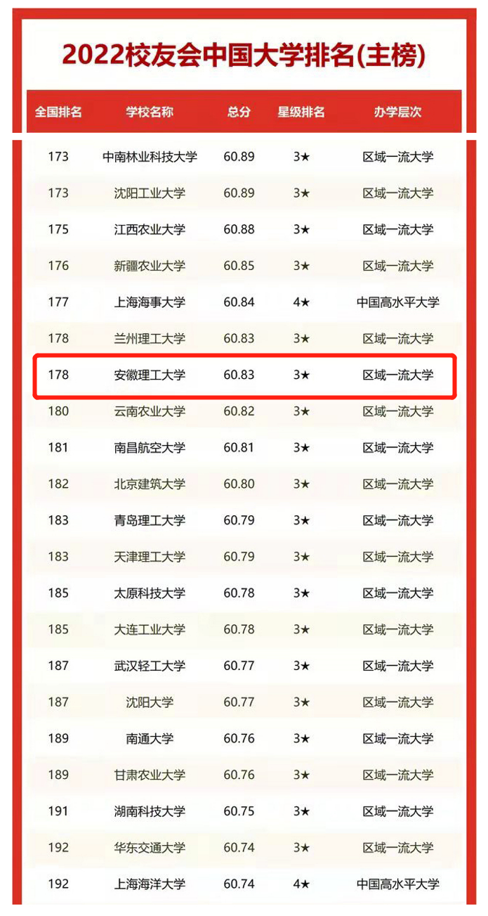 我校在艾瑞深中国校友会网2022中国大学排行榜中位列第178名,较2019年提升112位,较2020年提升79位,总评得分较2021年提升0.03分。