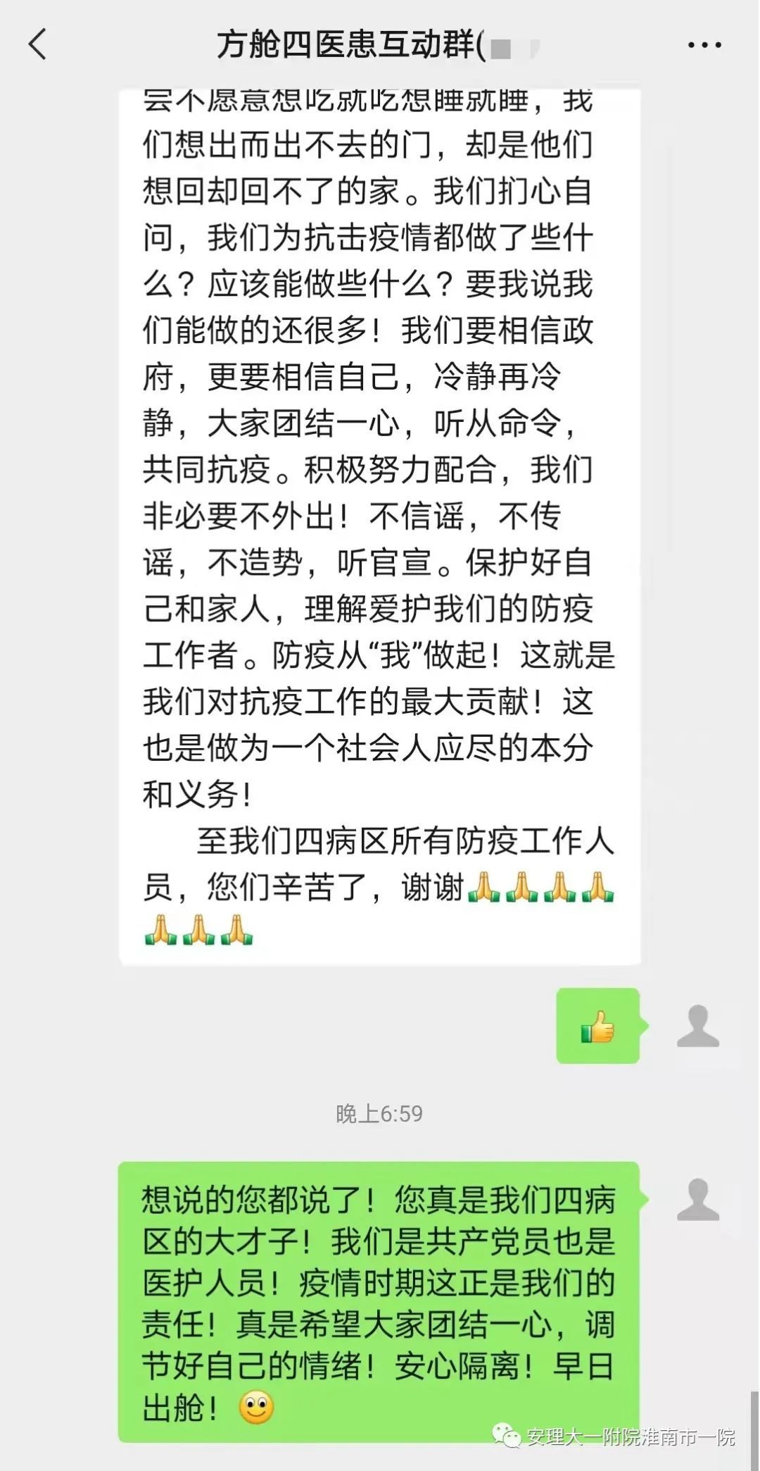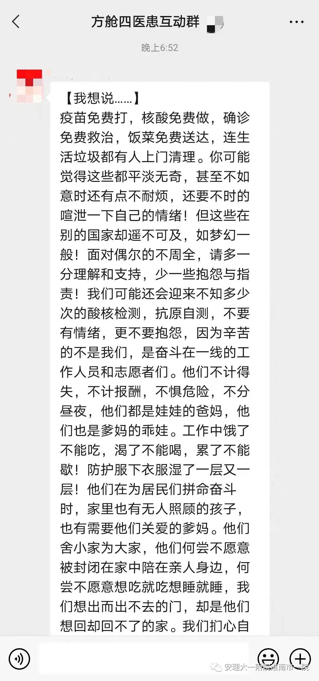 郭先生身在方舱,直接接触了一线的医护人员,最深切的感受到了他们的付出和辛苦,又通过网络看到了个别人不配合防疫工作。他一直在想:“我一定要为防疫工作做点什么!”想到这里,他激动的心慢慢平静下来,这些天在方舱内自己亲身经历的一件件温暖的事出现在眼前。他打开“方舱医患互动群”。一字一句写下了心中想说的话。6点52分,他将“一封信”发在了群内——传播正能量,防疫从我做起,就是我们对抗疫工作最大的贡献,这封信的标题是“我想说……”,四病区护士长顾影十分感动,回复道:“希望大家都能够团结一心,早日出舱!”