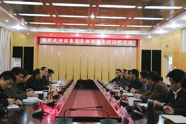 10月31日上午,阜阳市临泉县政协主席罗惠新、副县长徐飞携该县教育局、招商局、扶贫办等部门负责人一行来校,就学校下一阶段对口帮扶临泉县的有关工作进行商议。校长颜事龙及学校相关院处负责人参加会议。会议由财务处处长朱炜主持。