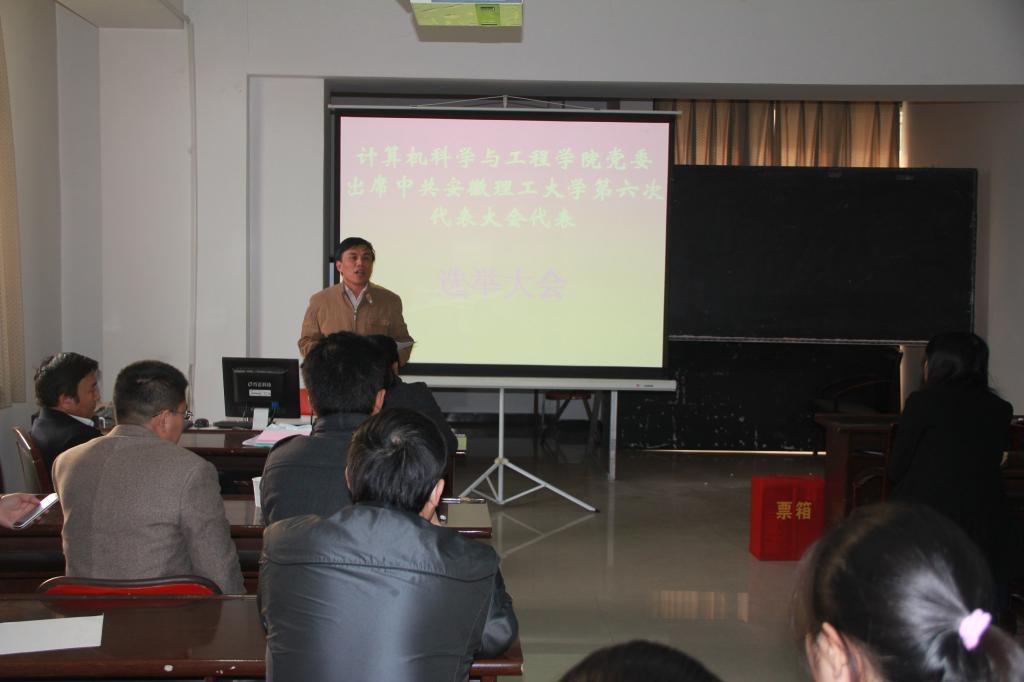 大会传达了学校党委关于校第六次党代会代表选举工作的有关文件精神,宣读了学校党委关于计算机学院代表候选人的批复,表决通过了选举办法、监、计票人名单, 说明了代表候选人提名推荐经过,介绍了代表候选人基本情况,并按照规定程序进行了选举。