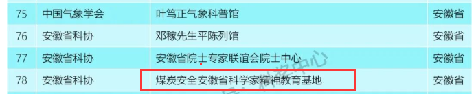 日前,中国科协公布了2022年度科学家精神教育基地认定名单,经安徽省科协推荐,我校“煤炭安全安徽省科学家精神教育基地”入选。