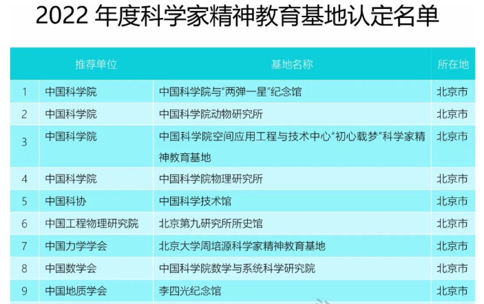 据悉,此次首批“科学家精神教育基地”是由中国科协联合教育部、科技部、国务院国资委、中国科学院、中国工程院、国防科工局7部委共同组织开展的一项工作。全国共有473家单位申报,类型包括科技馆、国家重点实验室、重大科技工程纪念馆(遗迹)、科技类人物纪念馆和故居、科研院所、学校、科技企业,以及其他等8个类别。经过初评、终评和公示等程序,7部委决定命名中国科学院与“两弹一星”纪念馆等140个单位为2022年度科学家精神教育基地,建设期至2026年。