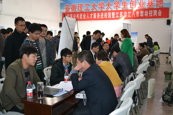 11月15日上午,江苏公共就业人才服务进校园暨江苏省沿江八市联动招聘会在大学生创业基地举行。南通、镇江、扬州、泰州、泰兴、兴化、如皋等江苏省沿江市人才中心组织51家用人单位前来我校选聘2014届毕业生。200多名毕业生与用人单位达成初步意向。