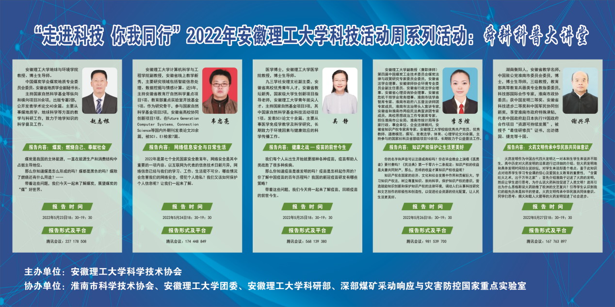 5月21日至28日是2022年全国科技活动周,安徽理工大学科学技术协会,在安徽省科协的指导下,以“走进科技 你我同行”为主题,通过“线上+线下”方式,开展了系列科普活动。活动重点展示宣传我校促进工业发展、惠及百姓民生、助力美好生活的科技创新成果,营造全校师生“爱科学、讲科学、学科学、用科学”的浓厚科研氛围。