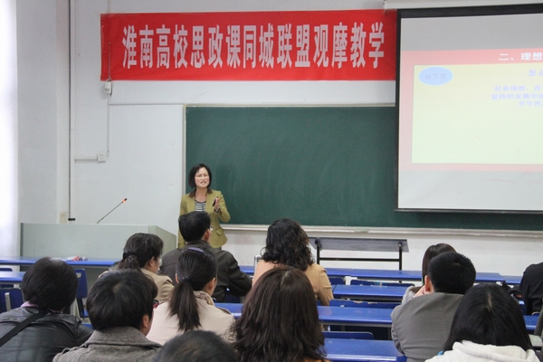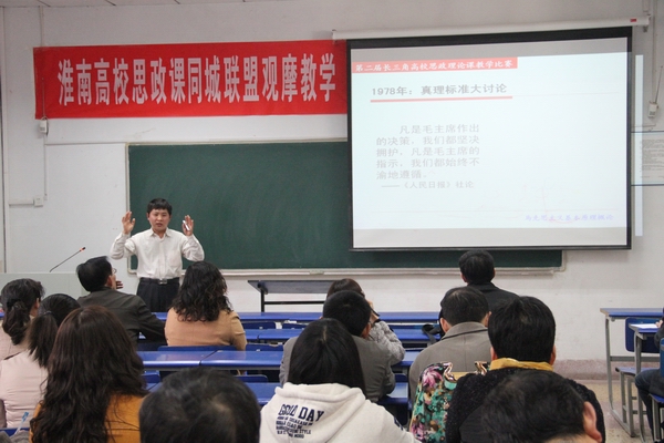 在此次研讨会之前,安徽省首届思政理论课教学比赛一等奖获得者淮南师范学院马克思主义学院庞秀艳、安徽理工大学思政部王宏兴两位老师分别就“理想的形成及其差异性”、“ 真理的检验标准”等内容举行观摩教学。主讲教师备课充分,内容熟练,运用现代教学手段和启发式、参与式教学方法,理论联系实际,幽默诙谐,赢得了观摩教师的一阵阵掌声。
