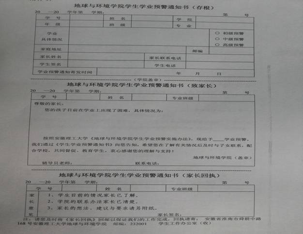 开学初,各年级辅导员根据学生成绩及获得学分情况确定进入学业预警范围的学生。学业预警分为初级预警(警示重修),中级预警(警示试读),高级预警(警示编下或退学)三个等级。根据学生不同学业情况,向预警学生下达《地球与环境学院学生学业预警通知书》。同时向学生家长转达学业预警通知,提醒家长及时对孩子进行教育,配合学校督促学生努力完成学业。对家长反馈信息,辅导员要及时整理,并建立相关档案备查。对于被高级预警学生,除向家长转达学业预警通知外,辅导员约请家长来校就预警学生的学业情况进行面谈,保证每学期两次以上的主动与家长电话联系,并做好联系方式、时间、内容等信息的记录。受到学业预警的学生,辅导员、班主任不定期与被预警学生谈话,及时了解学生学习生活情况,对学生进行动态跟踪管理,督促学生提高学习质量,并且根据学生学业实际情况,采取集体自习、学习辅导等方式帮助学生完成学业。学业预警工作实施以来得到了学生的认可、家长的支持,取得了初步成效。