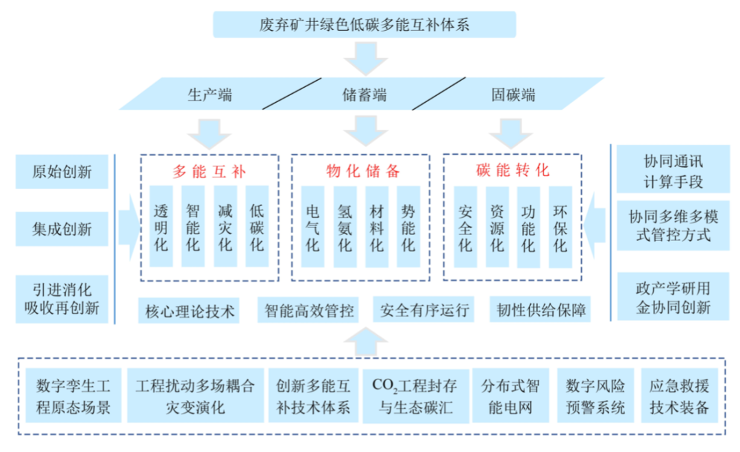 废弃矿井多能互补体系聚焦低浓度瓦斯抽采利用、新能源综合开发利用、新型综合储能、煤基多源固废利用、分布式智能电网、数字孪生全息联动领域,突出原创性、突破性、颠覆性、引领性创新,着力加强战略研究、基础研究、共性技术与装备攻关,破解高效生产、多能转化、减固碳关键核心技术,优化工艺技术, 保化、安全化、资源化、功能化,支撑净零碳数字能源 实现能源生产端透明化、智能化、减灾化、低碳化,能 供储工业。 源转化端电气化、氢氨化、材料化、势能化,固碳端环保化、安全化、资源化、功能化,支撑净零碳数字能源 实现能源生产端透明化、智能化、减灾化、低碳化,能源供储工业。