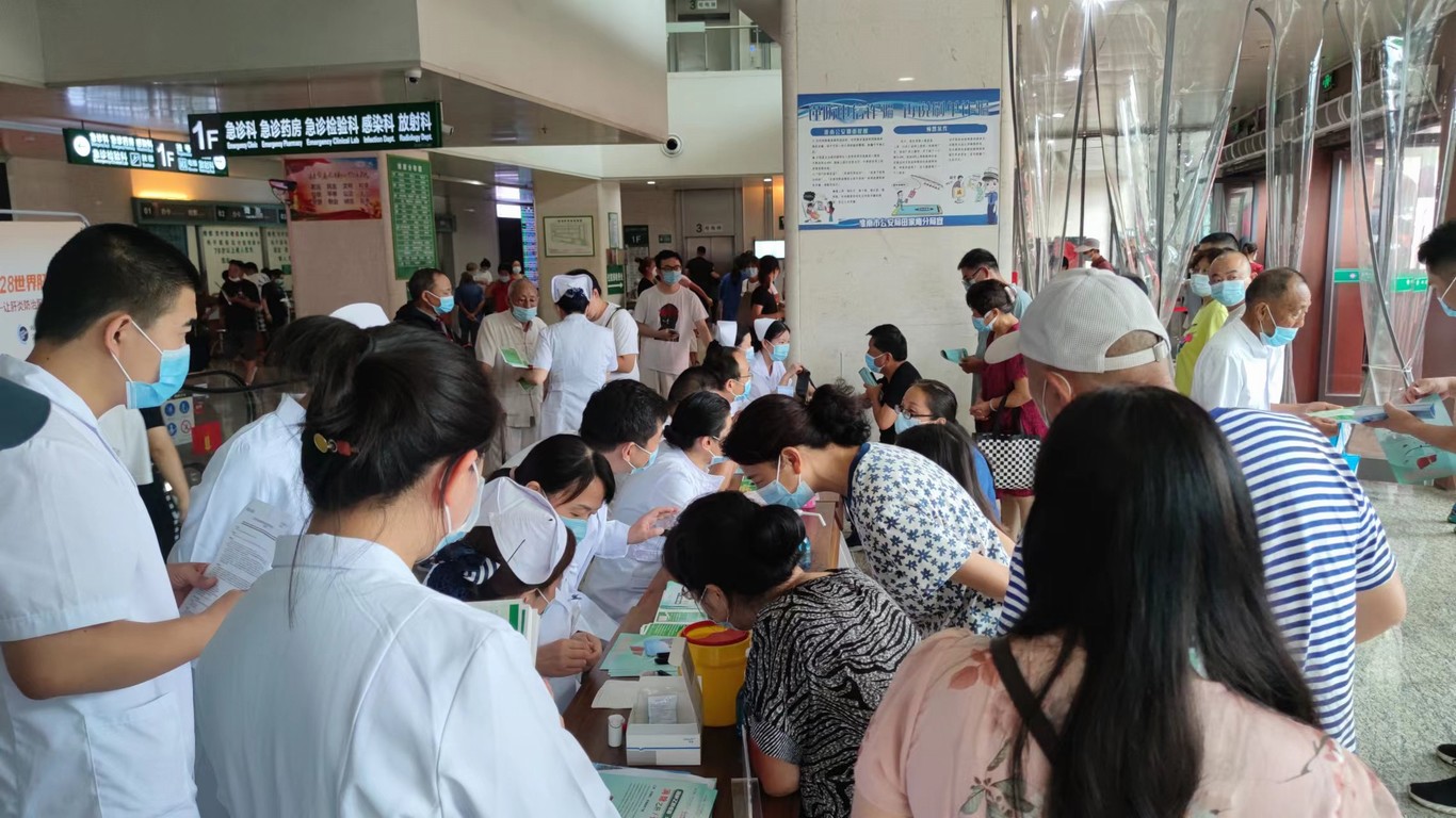 当天上午,我校第一附院组织多科室专家在门诊一楼大厅开展“世界肝炎日”义诊、宣传活动。活动现场,一附院感染性疾病科主任、副主任医师王严忠,感染性疾病科副主任、主任医师朱永兵,检验科副主任、主任检验技师胡素侠,肿瘤内科副主任,副主任医师王勇,多位专家现场为群众提供义诊服务,为群众答疑解惑,普及相关健康知识。同时现场发放宣传彩页,现场电子大屏滚动播放的世界肝炎日宣传视频,向群众普及防大于治的理论,介绍疫苗接种及防控的重要性。现场提供的免费乙肝抗体检测深受群众欢迎,纷纷排队前来检测。