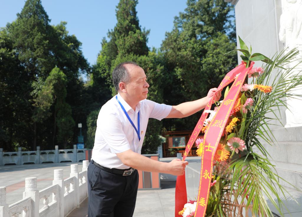 实景党课环节,培训班全体学员来到金寨县革命烈士陵园。庄严、肃穆的革命烈士纪念碑就位于安徽省金寨县中心区域的革命烈士陵园。陵园内,松柏苍翠挺拔,通往烈士纪念碑的台阶一尘不染,厚实的花岗岩像一列列士兵整齐有序,引领瞻仰的人们一步步拾阶而上,重走先烈们的长征路,回首烽火硝烟里的感动。 2016年4月,习近平总书记亲临安徽视察指导,第一站就来到金寨祭奠英灵、缅怀先烈,并亲笔题词:“一寸山河一寸血,一抔热土一抔魂。回想过去的烽火岁月,金寨人民以大无畏的牺牲精神,为中国革命事业建立了彪炳史册的功勋,我们要沿着革命前辈的足迹继续前行,把红色江山世世代代传下去。”先烈们为共和国立下的功勋值得我们后人永远敬仰和铭记!在金寨红军广场,全体学员拾级而上,步行至革命烈士纪念碑正前方肃立,举行向革命烈士纪念碑敬献花篮仪式。工作人员缓缓抬起花篮,正步来到革命烈士纪念碑前,将花篮安放在纪念碑基座上。郭永存缓步走上前去,悉心整理花篮缎带。全体同志深深三鞠躬,表达对革命烈士的深切缅怀和无限敬仰。在革命烈士纪念碑下,全体党员面对着鲜艳的党旗,在郭永存的带领下重温入党誓词。铿锵激扬的誓词声在红军广场久久回荡,体现出大家赓续红色血脉,不忘立德树人初心,牢记为党育人、为国育才使命的坚定信念。