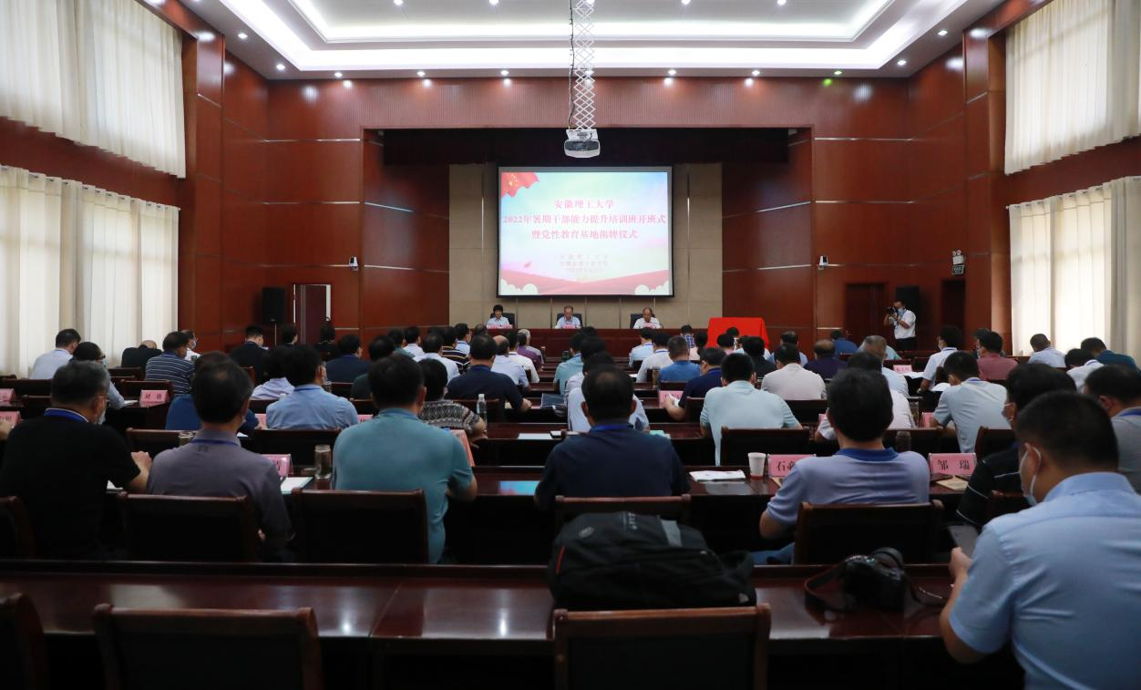 为深入学习贯彻习近平总书记关于教育的重要论述,全面落实立德树人根本任务,提升领导干部的理论素养和综合能力,持续深入推进学校“双一流”创建,更好服务支撑安徽省“三地一区”建设,8月2日,学校2022年暑期干部能力提升培训班开班式暨党性教育基地揭牌仪式在安徽金寨干部学院立清楼二楼报告厅隆重举行。校党委书记郭永存,金寨县委副书记、县长张涧,校领导孟祥瑞、郑明东、鲁超出席仪式。安徽金寨干部学院副院长吴继彩主持仪式。