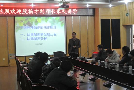 12月18日下午3:00,应科技产业处和地球与环境学院的邀请,安徽省环保厅副厅长殷福才教授级高级工程师来校进行学术交流,在校本部图书馆1楼北会议室作了题为“中国环境保护的法律制度”的报告,报告会由院长胡友彪教授主持,学院教师及各年级研究生聆听了报告。