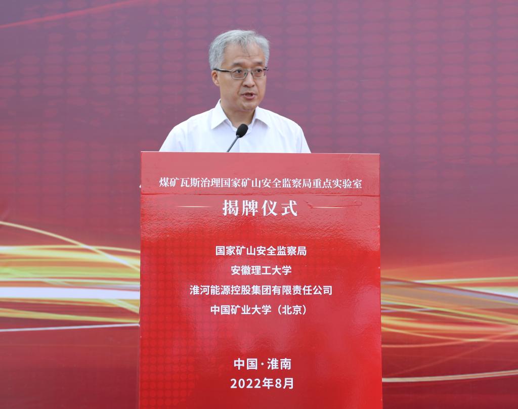 郭永存代表学校向国家矿山安监局对学校的关心和支持表示衷心感谢,向出席仪式的各位嘉宾致以诚挚欢迎!郭永存全面回顾了学校历史及近年来学校各项事业发生的深层次、格局性变化。他表示,重点实验室的揭牌,标志着我校在助力国家矿山安全科技创新、服务行业高质量发展上迈上新台阶。煤炭工业是关系国家经济命脉和能源安全的重要基础产业。随着煤炭开采的深度逐年增加,煤炭开采面临的动力灾害必将更加严峻复杂,重点实验室着眼煤与瓦斯共采、瓦斯动力灾害致灾、多灾耦合及演化等研究方向,做好“政产学研用”协同创新、联合攻关,必将突破一批关键共性技术难题,形成一批助推矿山安全高质量发展的核心技术,推动一批科技创新成果转移转化落地见效。郭永存表示,学校将统筹优势力量,努力将实验室建设好、运行好、管理好,力争打造国家矿山安全领域标杆重点实验室,为煤炭行业安全生产提供有力的科技和智力支撑。