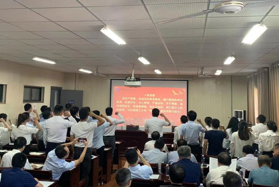 9月2日下午,安全科学与工程学院在宁远楼A410报告厅举行新教师入职宣誓仪式,学院2020年新成立以来进校的青年教师在全院教师的见证下,庄严宣誓:“忠诚党的教育事业,履行教师的神圣职责,热爱学生,为人师表,严谨治学,乐于奉献,做有理想信念、有道德情操、有扎实知识、有仁爱之心的好教师,为安徽理工大学‘双一流’创建而努力奋斗!”