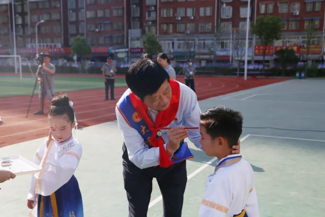 随后,一年级的新生代表为大家朗诵三字经,“以水为镜整衣冠,朱砂启智破懵懂”,老师们为现场的新生代表点朱砂,班主任在教室里同时进行。痣又通智,意为开启智慧,以此寄托美好的意愿,一颗颗红痣饱含着父母、长辈、学校的美好祝愿在额上闪耀,也在孩子心中勾画起一道道亮丽的风景。