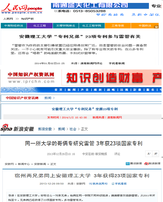 2013年12月26日,安徽网以“宿州两兄弟同上安徽理工大学,3年获得23项国家专利”为题进行了报道。随后,人民网、中国知识产权咨询网、新浪网安徽新闻、中国网魅力安徽、中安在线、安青网、淮南报业新闻网等网站以“同所大学亲兄弟专研究雷管,3年获23项国家专利”、“安徽理工大学‘专利兄弟’23项专利多与雷管有关”、“安徽理工大学‘专利兄弟’坐拥23项专利”等题目进行了转载报道。