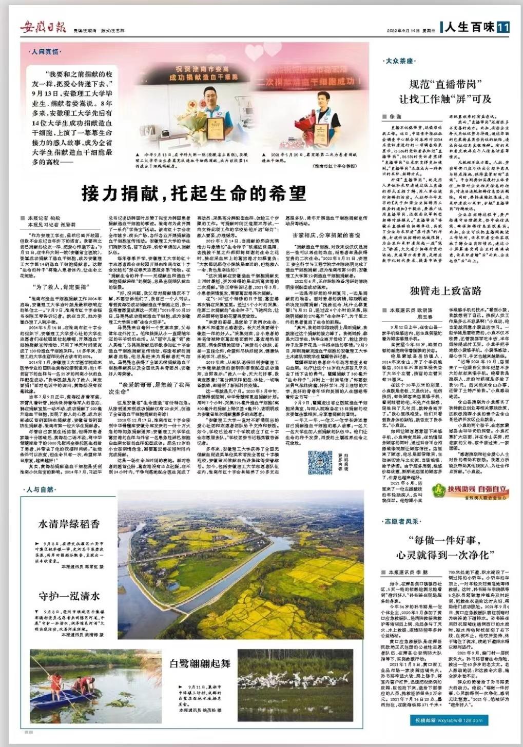 9月13日,《安徽日报》以《14名同学上演“生命接力”,这所大学不简单!》为题,专题报道了我校14学子接力捐献造血干细胞,用大爱传递“生命火种”的感人事迹。