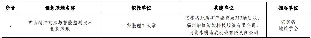 该创新基地由学校地球与环境学院牵头单位组织,联合安徽省地质矿产勘查局313地质队、福州华虹智能科技股份有限公司、河北永明地质机械有限责任公司共同申报。经安徽省地质学会推荐,为省内第一个获批的中国地质学会创新基地。