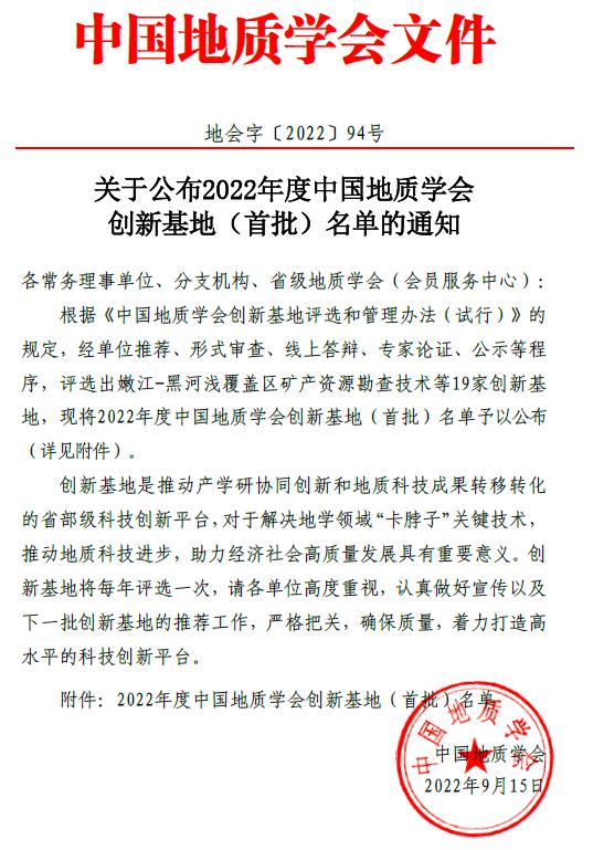 近日,中国地质学会公布2022年度中国地质学会创新基地(首批)名单,全国共有19所创新基地入选。由我校牵头申报的“矿山精细勘探与智能监测技术创新基地”成功获批。