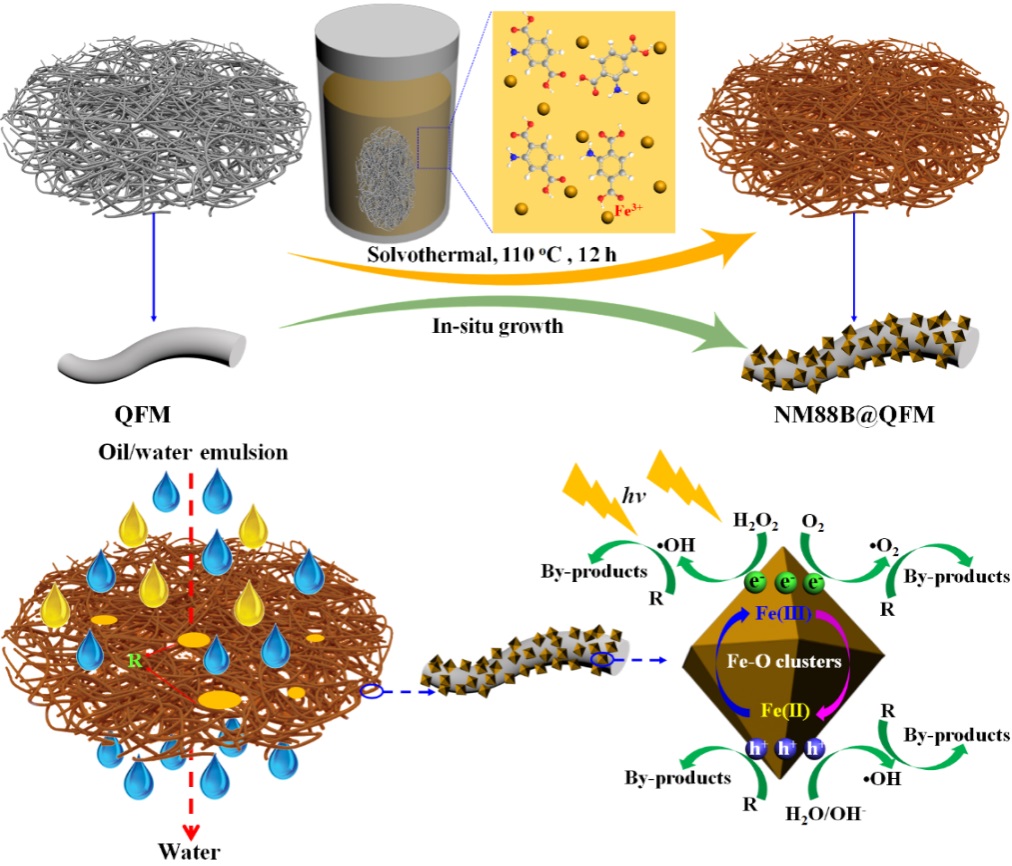 近年来,超亲水/水下超疏油膜在含油污水处理中引起广泛关注。开发高性能低压驱动自清洁膜对缓解油水污染具有重要意义。该研究通过溶剂热法一步构建超强抗污NH2-MIL-88B包覆石英纤维膜(NM88B@QFM)用于高效低压驱动油水乳液分离。该膜具有良好的光芬顿自清洁能力和超亲水/水下超疏油性,其水接触角和水下油接触角分别为0o和161.3o。在单独重力驱动下,NM88B@QFM对一系列油水乳液展现出高分离效率和高渗透通量。循环分离后NM88B@QFM的水通量经光芬顿自清洁处理后几乎完全恢复。该研究成果为构建低能耗、高性能自清洁油水分离膜奠定理论和技术基础。
