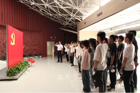 “我志愿加入中国共产党,拥护党的纲领,遵守党的章程,履行党员义务,执行党的决定,严守党的纪律……”烈士事迹纪念馆内,全体师生面向鲜艳的中国共产党党旗,举起右拳,庄严宣誓。