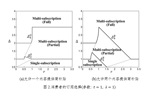 该研究以博弈理论和经济学理论为分析框架,从社会行为学的角度构建了消费者多重订阅行为的效用模型,对网络运营商的数据计划和内容提供商的数据补贴策略开展研究。研究发现,CP的独家内容和广告收益率是ISP设计数据补贴计划的关键因素。只有当广告率较高时,网络运营商才会允许两个CPs对数据进行补贴,当独家内容较多时不允许任何一个CP进行补贴,而当独家内容较少时则只允许一个CP进行补贴。这将促使被允许补贴的CP在拥有较多的独家内容时诱导消费者进行多重订阅。允许两个CPs同时补贴的策略会进一步刺激部分消费者从独家订阅转向多家订阅以最大化其剩余。研究结果对于数字内容行业的运营实践具有重要的管理启示。