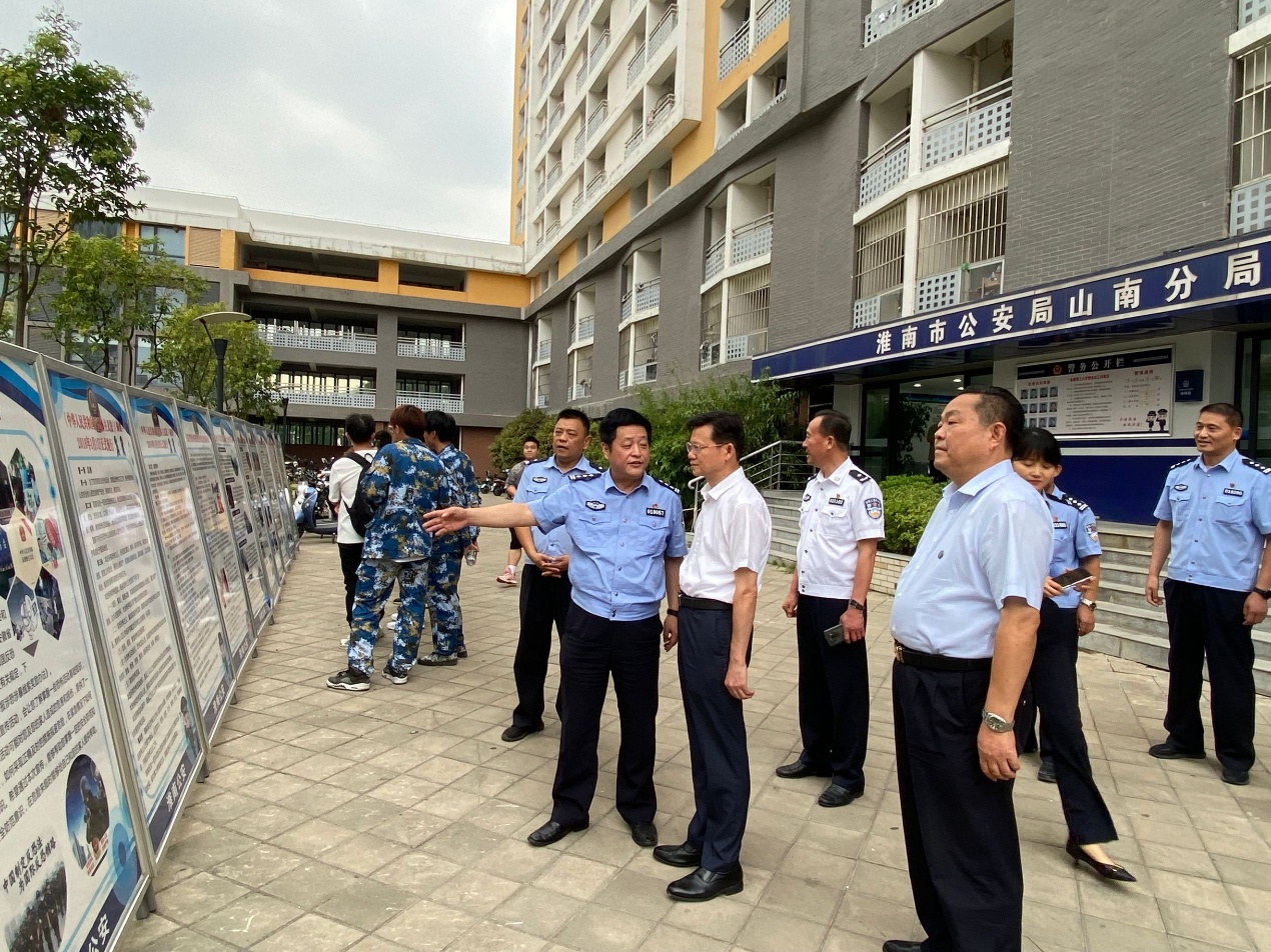 淮南市公安局副局长缪全,山南公安分局局长马义美,公安机关相关部门负责人,学校保卫处相关人员参加检查。