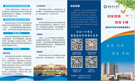 加强资助政策宣讲,讲好资助故事。学校将资助政策宣讲前移,把政策和关爱早早送到学生手中。在招生宣传阶段,学校选聘国家奖学金获得者、国奖励志奖学金获得者和退役复学学生担任学校学生资助宣传大使,并举办资助政策宣讲会,为学生及家长宣传普及国家资助政策。在新生录取阶段,印制《安徽理工大学学生资助政策简介》并随录取通知书寄送到每个新生,确保同学们在入学前就对国家及学校的资助政策有所了解。通过“安理学工”“易班”等网络公众号推送学生资助政策及绿色通道等相关内容。
