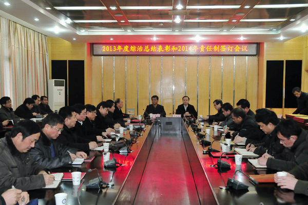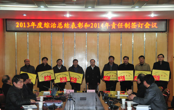 1月20日下午,2013年度综治总结表彰暨2014年责任制签订会议在校图北会议室隆重召开。校党委书记颜事龙、校长郭永存以及副校长叶醒狮、王其东出席会议并为19个综治先进单位、3个大学生安全知识竞赛优胜单位颁奖。会议由校党委常委、校党政办主任张海军主持。