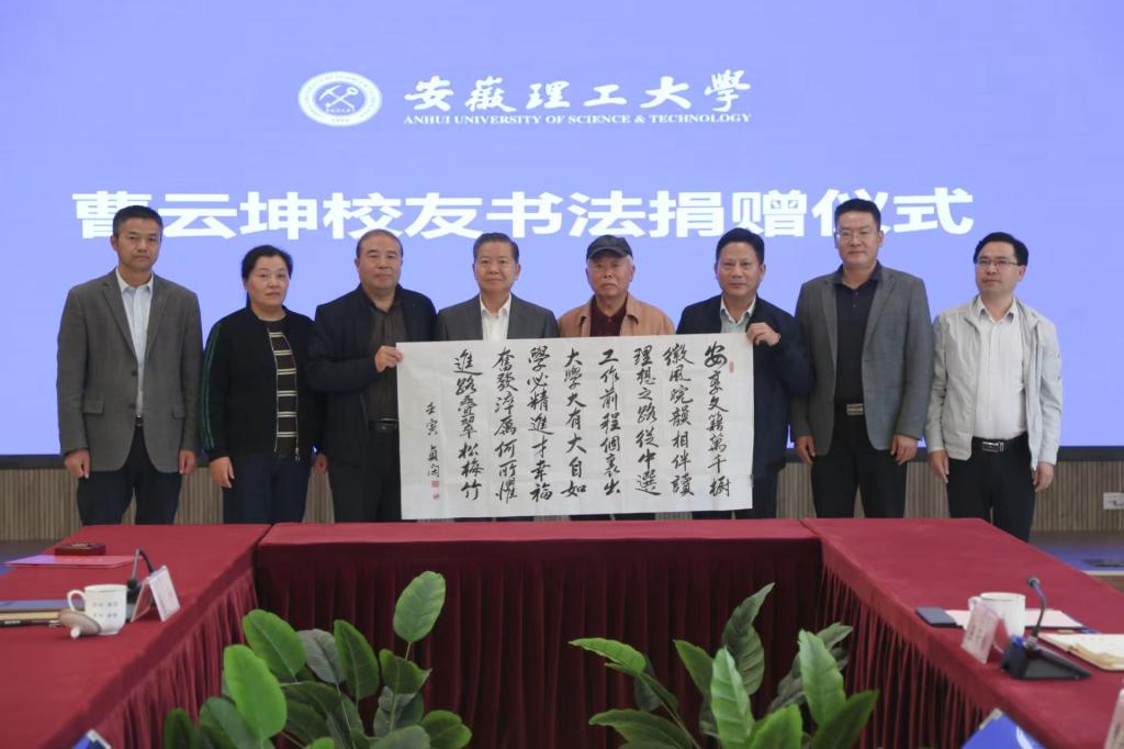 11月10日下午,学校在舜耕苑二楼会议室隆重举行曹云坤校友书法捐赠仪式。我校1969届(原淮南化学工程学校化工机械安装专业)优秀校友曹云坤为母校捐赠自主创作的200多幅书法作品。校党委副书记、校长袁亮出席捐赠仪式并讲话。