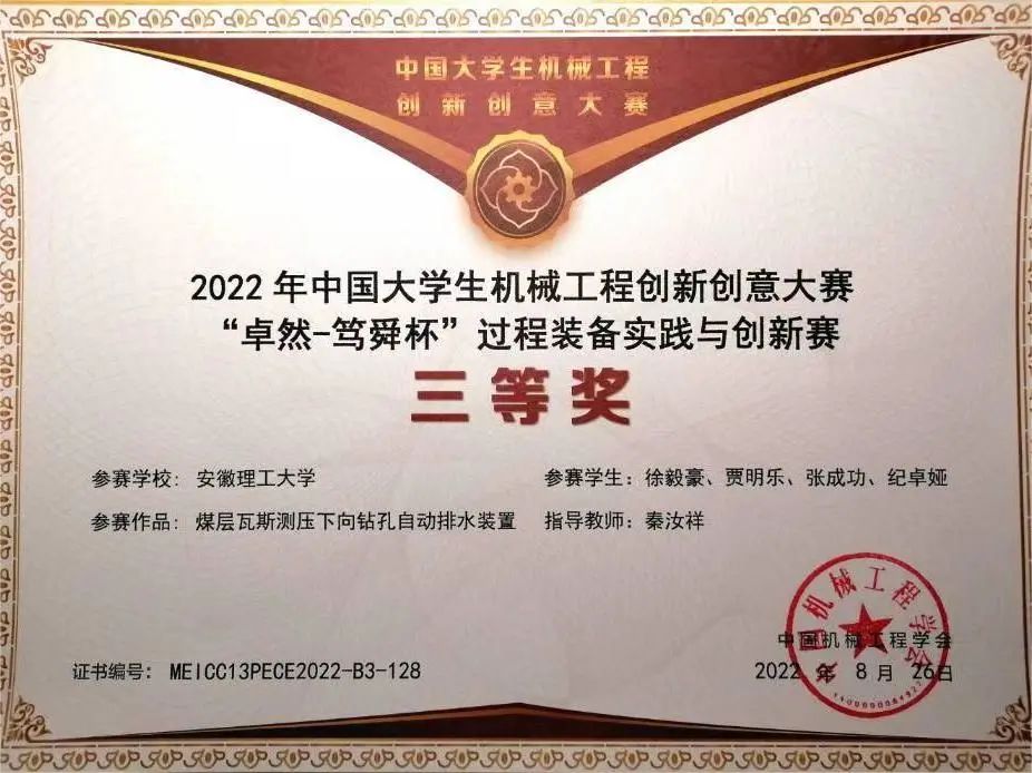 之后,徐毅豪偶然的机会认识到了秦汝祥老师,秦老师对科研严谨的态度和精神令他敬佩,他主动加入了秦汝祥教授的科研团队,并以负责人的身份参与了煤层瓦斯测压钻孔自动排水装置的研究,主要负责总体设计,制作实物,带队实验,项目的文稿,数据整理以及论文撰写。这个装置主要是用于煤层测压以及钻孔排水,可以减少巷道和钻场工程量,符合绿色发展理念,提高经济效益。为了完成这个实验装置的研制,徐毅豪两年暑假都留在学校。时值盛夏,加上交通不便,徐毅豪常常步行去一个敞篷的工厂进行实地操作。但实物装置在设计过程中过于理想化,导致现实与设计产生一些出入,比如,装置的外部是柱形模拟环境,如果在柱形上直接打孔固定内部装置就会造成泄露的问题。经过与老师同学的反复讨论,最后采用法兰密封和胶密封的方法实现了封堵。另外,材料的采买也是需要考虑的问题。因为研制的装置要求高度密封性,并且需要不断向内输送压力,还要保证装置的可视化程度高,所以在设计时,徐毅豪比对了大量适用材料并计算了装置底部的最大压力后,确定使用亚克力材质。但在实施过程中,部分材料的采购还是出现了问题。“装置结构中的毛细管束组,毛细管内径要求有很高的精度,以保证实验结果的精确,但工艺要求高必然会使工件造价成本高,而科研项目经费是有限的,需要我们尽可能地降低采购成本,并避免因加工周期延长给科研任务的顺利完成带来的影响。”徐毅豪说道。从开始设计到装置的制作以及期间的不断调试再到其满足实际使用要求,耗费了三个多月。也是在制作过程中,徐毅豪以商业化的角度思考了其能为煤矿带来多大的实际效用与经济效益,其后徐毅豪联系其他学院的同学以“钻碳取水—智矿建设先锋”为主题参加了2022年“互联网+”大学生创新创业大赛,并获得了省银奖。