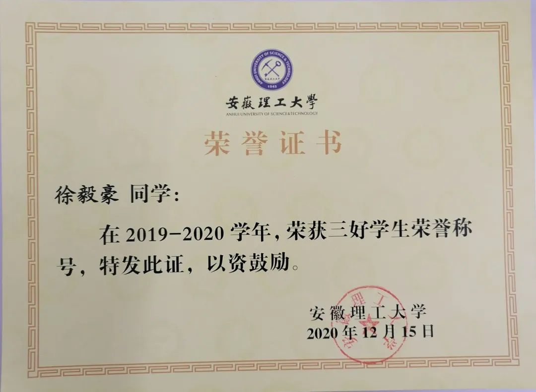 本科期间连续两年获校一等奖学金,三次获得三好学生,一次三好学生标兵,优秀学生干部。作为第一作者在北大中文核心期刊发表学术论文一篇,主持一项国家级、两项省级大学生创新创业训练计划项目,主持一项大学生创业基金扶持项目、以及2022年大学生创业基金追加扶持项目(全校仅两件获批),徐毅豪在校期间带队自主研制煤层瓦斯测压下向钻孔自动排水装置;拥有一项实用新型专利(一种超细水雾影响可燃气体爆炸特性实验装置)和一项软件著作(钻孔瓦斯压力、水位智能在线监测系统)。
