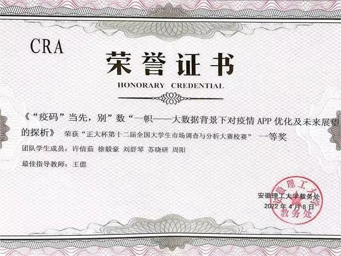 在校期间徐毅豪积极参加各类学科竞赛。在2022年“互联网+”大学生创新创业大赛中获得省银奖(第一);在2022年过程装备实践与创新赛中获得全国三等奖(第一);在大学生数学建模竞赛获得安徽省本科组三等奖;“认证杯”数学建模大赛二等奖,正大杯第十二届全国大学生市场调查与分析大赛校赛获得一等奖等。此外,徐毅豪还是一位古典吉他的爱好者,练习古典吉他长达9年。