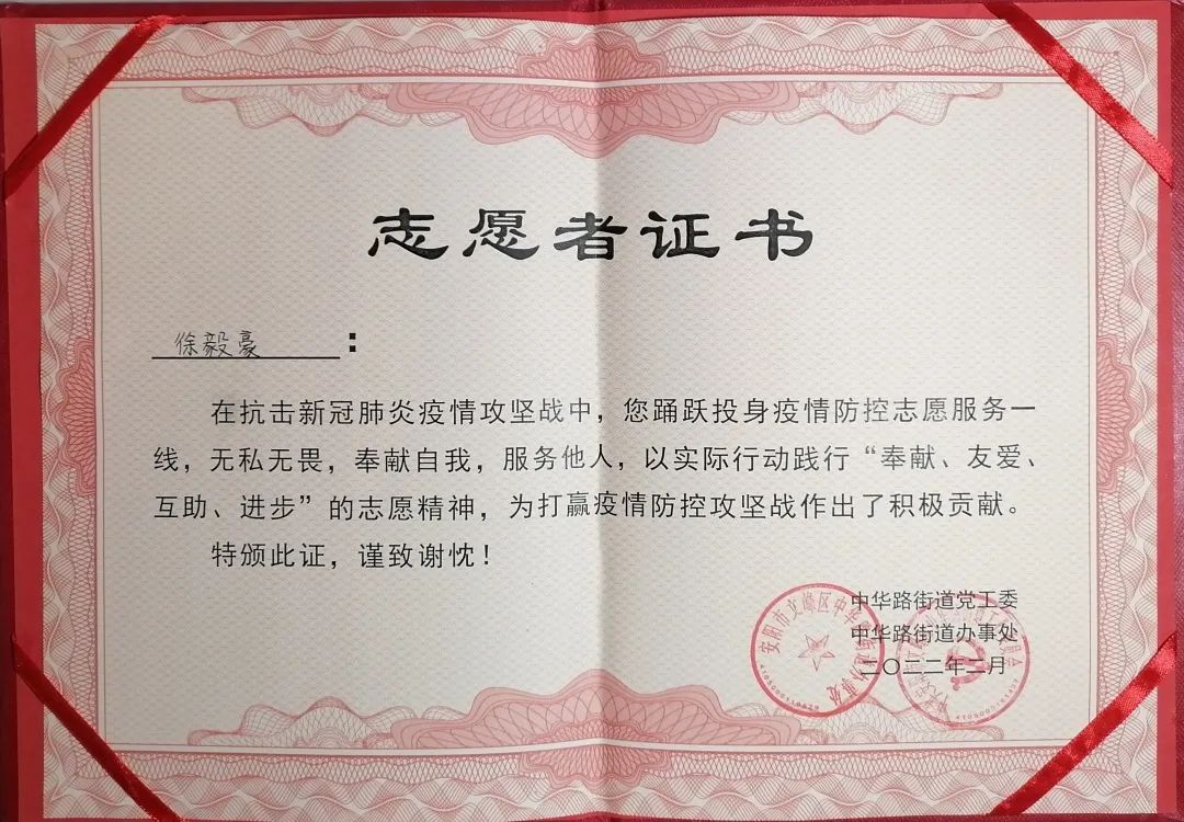 青春因奉献而闪耀。2019年淮南国际马拉松比赛中,徐毅豪作为志愿者参与其中,积极完成服务工作,为国际运动员指引路口,沿途分发补给食物。在这次活动中,让徐毅豪感受到了志愿服务工作的魅力,体会到了“赠人玫瑰,手有余香”的快乐。因此,在2022年年初疫情期间,徐毅豪坚定的报名参加了家乡河南安阳的核酸志愿者。在核酸检测口,徐毅豪需要引导市民扫码填写信息,帮助医护人员采集录入信息并协助核酸样本送检。在志愿服务中,最令徐毅豪感动的就是大家万众一心,共同守望相助的信心与决心。由于长期在冬季的室外,只佩戴橡胶手套难以抵御寒冷,徐毅豪手套里的手早已冻得冰凉。期间,有位陌生的阿姨主动地为志愿者们送来暖手袋,用最质朴温暖的方式表达对他们的关心,像冬日里的一抹暖阳,在心中种下炙热的火种。在核酸检测过程中,信息的录入对于低龄儿童来说也是十分困难的。徐毅豪总会耐心的与小朋友的家长沟通,指导他们正确完成未成年人信息绑定。他认真负责的态度帮助了很多人解决问题,也得到了大家一致的认可与赞美。小朋友们还会在做完核酸后特意跑过来对徐毅豪说“哥哥辛苦啦,谢谢哥哥!”小孩子脸上绽放出的纯真的笑容让徐毅豪十分动容。“大家都团结一心,相互理解,我感到十分温暖,我觉得我做的这件事是有价值的,有意义的,这是让我特别自豪的事情。”付出关爱和行动,回报的是快乐和满足。徐毅对笔者说,疫情防控取得成功这不只是某一个人的功劳,而是全体医护人员、志愿者和所有市民共同的成果,在大家齐心协力相互配合下,国家才能更加繁荣强大,社会才会变得越来越好。“我觉得我做的还不够,在未来我还想做更多的志愿服务,帮助更多的人。”因为热爱,所以坚持,这是徐毅豪对志愿服务的满腔热忱。
