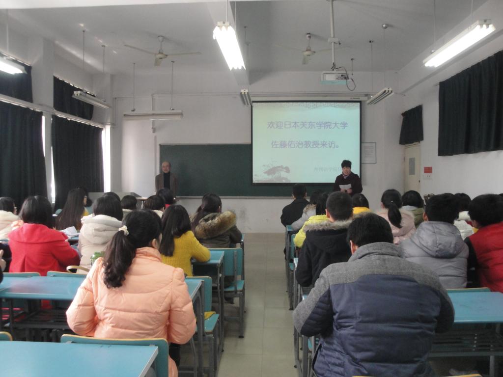 下午,佐藤佑治教授为外国语学院教师和日语系学生作了题为《日中の同文意義語》的学术讲座。佐藤教授首先围绕“信”和“学院”这两个词为大家解释了同文异意一词的意思,列举一些具体词汇来说明它们在中日文中用法的区别,讲解了中日文化差异,介绍了日本大学的分类和基本现状以及日本最有名的几所国立、公立和私立大学,传授了日文学习方法,推荐了很多对日语学习有用的书籍和影像,如黑泽明导演的《七人の侍》、山田洋次导演的著名连载电视剧《男はつらいよ》、大河剧《北の国から》等。