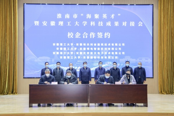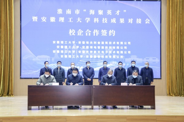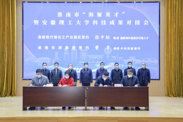化学工程学院学术副院长张中标教授作为国家海外高层次引进人才与淮南市煤化工园区签约受聘。机械工程学院、电气与信息工程学院、材料科学与工程学院、计算机科学与工程学院分别与安徽埃夫利舍建筑技术有限公司、安徽领电智能科技有限公司、安徽光神航天电子技术有限公司、安徽图联科技有限公司签约校企产学研合作。任泽锋、张志强、郭永存、余玉刚、欧冬林、宋立民、戴宜斌、王先江见证签约。