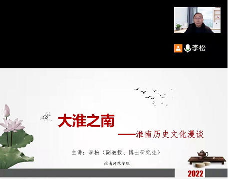 11月19日上午,我校邀请淮南师范学院马克思主义学院副教授李松为全校楚淮文化爱好者开展了题为“大淮之南——淮南历史文化漫谈”专题讲座,230余名师生线上聆听了报告。李松以淮南的历史文化背景开篇,从印象淮南——“五彩之城”讲起,称其为古老与现代、粗犷与温婉、保守与开放的交融地;接着,讲述了淮南著名的历史人物以及历史文物的挖掘史,并从淮南的历史地理环境、古今三题和淮南文化散论三个方面为同学们呈现了淮南悠久的历史和深厚的文化积淀。最后,他探讨了淮南的历史文化问题,从古淮南文化剖析,指出淮南文化融合了东西南北中,提倡大家深入学习了解淮南文化。