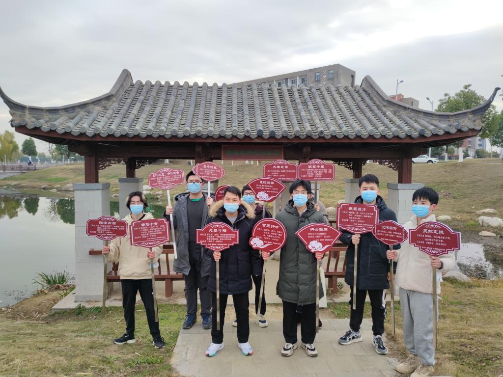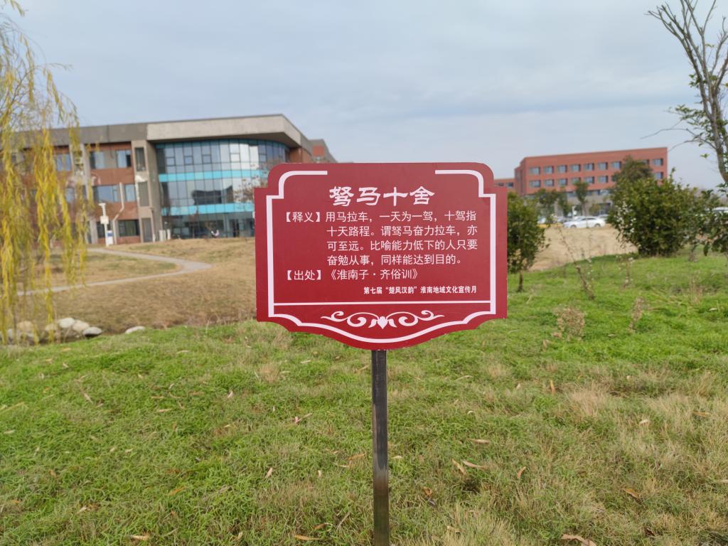 11月下旬,组委会充分利用学校东组团东南侧的地理地貌优势,沿着水系串联的荷心亭、石桥冬雪、拾翠轩、濯缨湖四个景观小品分别打造了《淮南子》认知园、《淮南子》成语典故长廊、楚淮之声阅读空间、二十四节气观感点等四处楚淮文化体验区。在认知园,同学们可以了解“绝代奇书”的《淮南子》以及该书与淮河文化、道家文化与楚文化的渊源;在成语典故长廊,出自于《淮南子》的成语,如跛鳖千里、沉浮俯仰、尺壁寸阴、础润而雨、戴圆履方、行合趋同、浃髓沦肤等14组成语典故,提醒着人们行事要方正不苟、奋勉从事,坚持不懈、追求卓越;在阅读空间,为青年学生提供了一个可以仰首朗诵、低头吟唱、无限感怀、激情辩论的空间,形成了一道靓丽的校园风景线;在二十四节气观察点,大家可以结合观察花草鸟虫的变化体会物候转变、节气轮回,既能了解先民的大智慧,又能感悟光阴的珍贵。