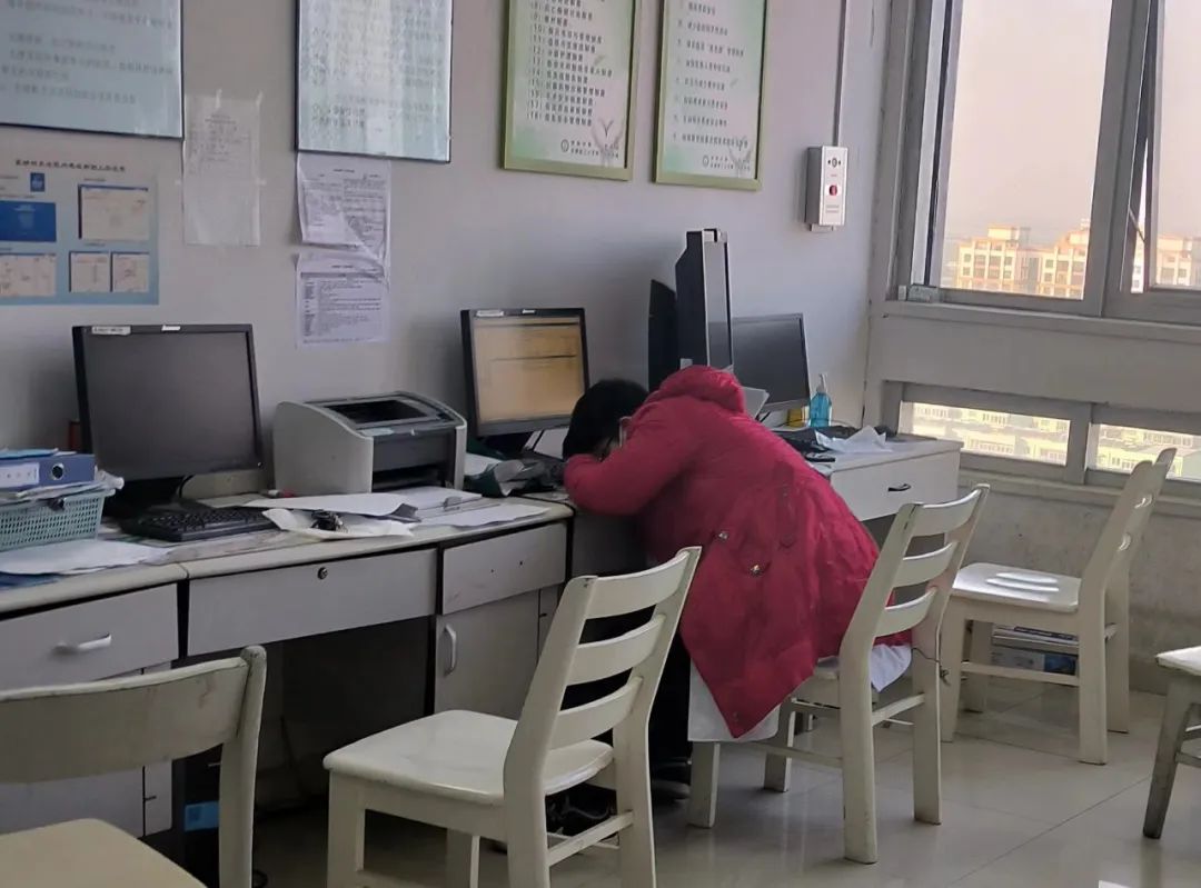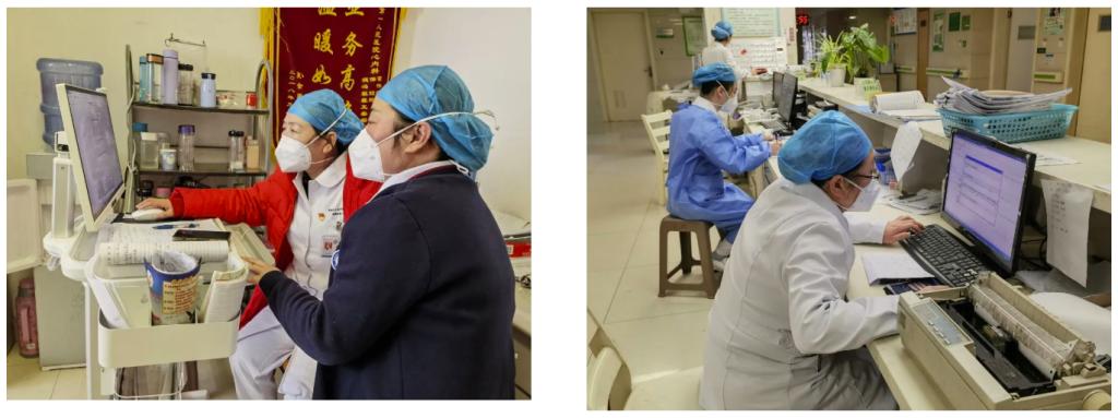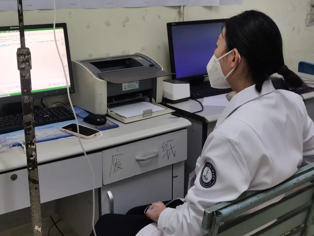12月23日超声科室医生工作站,杨燕医生、王琮医生以及王雅雯医生,克服身体不适,病中完成住院病人与门诊病人的工作量。12月20日以来超声科繁重的夜班工作由李苏明、蔡维强、杨芳、王菲菲、左巍五人完成,在周边都是阳性患者自己不是阳性的时候没有因为恐惧而退缩,当自己变成阳性的时候夜班组医生同样也没有退缩、没有请假,带着病躯依然坚持工作。同样超声科陶巧云护士在身体不适的情况下依然奔走于楼上楼下为大家发放防疫物资,交代消毒流程。
