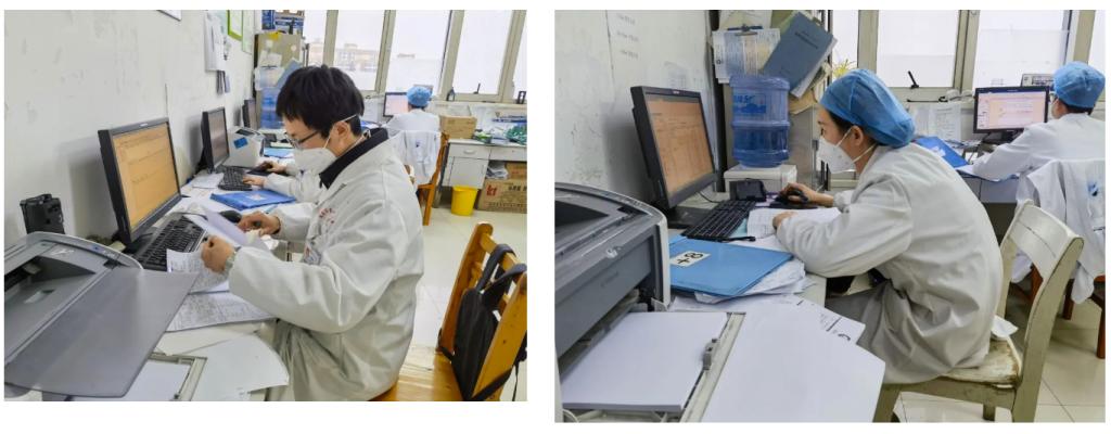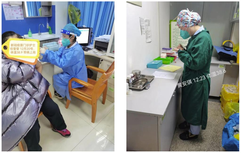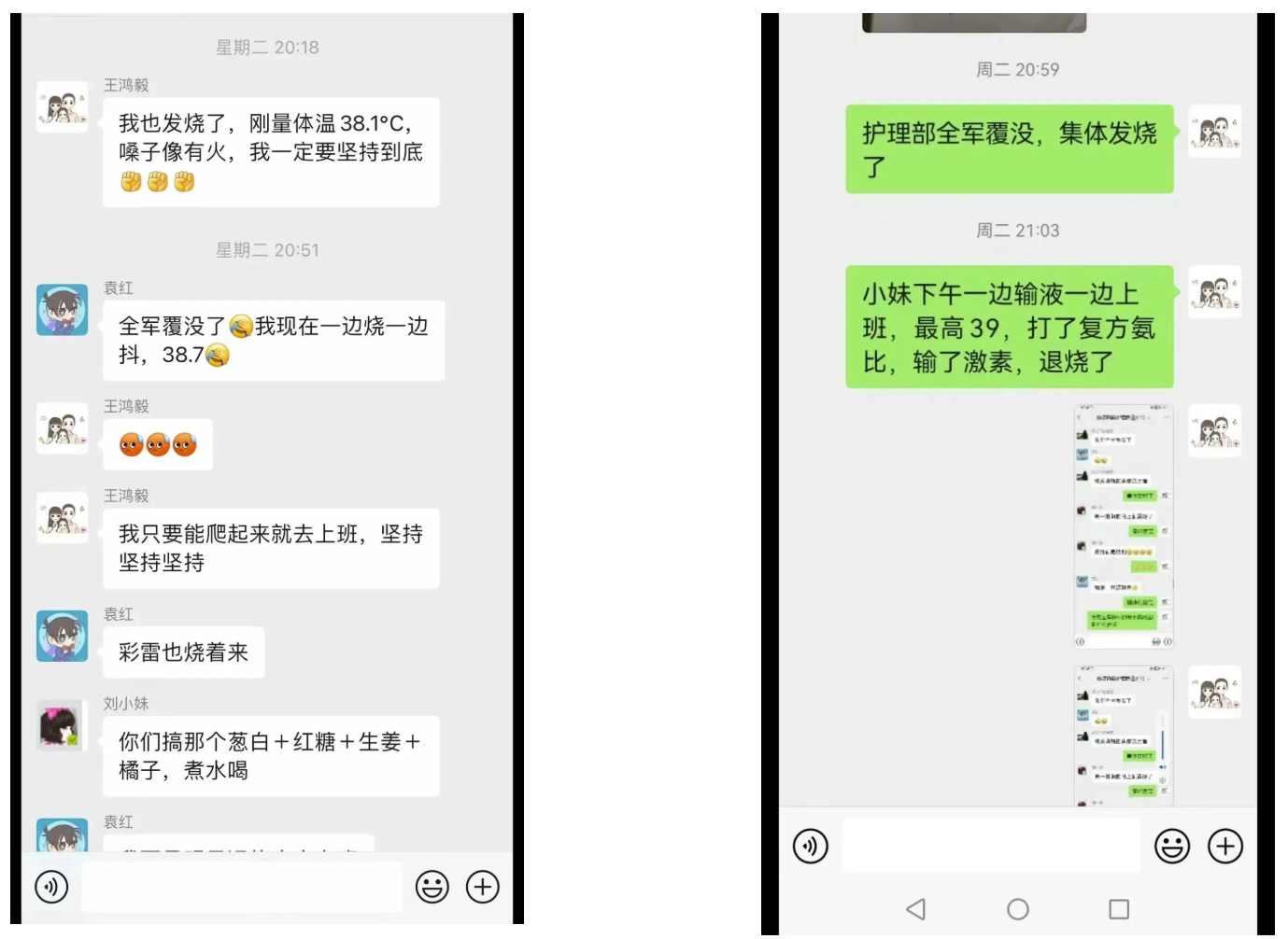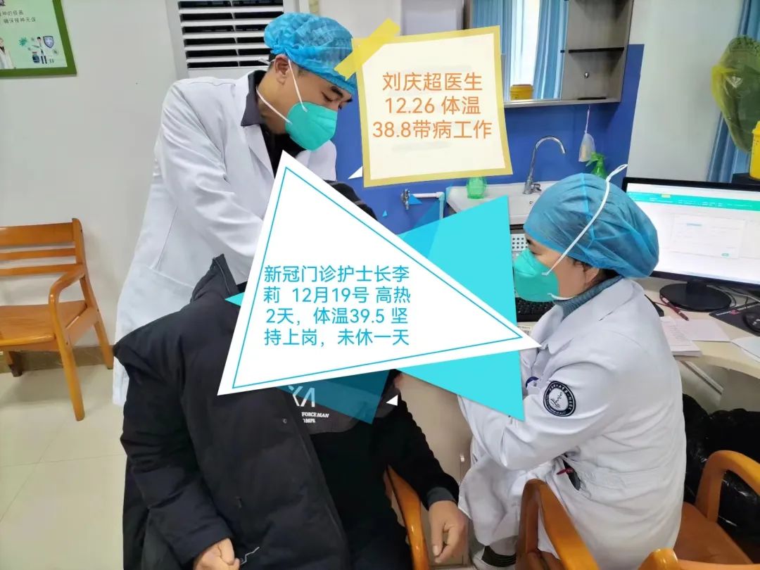 2022年12月19日—26日,临床药学室、治疗药物监测室多名药师均阳性条件下,发烧38.5℃轮流坚持工作,另外一边支援发热门诊。2022年12月21日—26日,发热门诊连凤珍、邱卓楠、姚梦雪、沈叶等均在嗓子干哑、身体酸痛、低热情况下,坚持上完发热门诊工作后再测核酸均阳性,12月25日上午,汤波药师早晨已发烧38℃,为了不影响上班,吃完退烧药后继续上发热门诊药房,发着烧的情况下传着厚厚的防护服,坚持6小时不喝水上完发热门诊的班,下班一测体温38.6℃,抗原检测已阳。