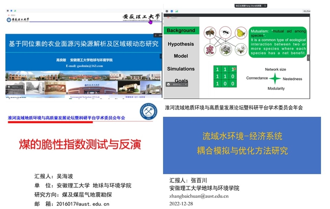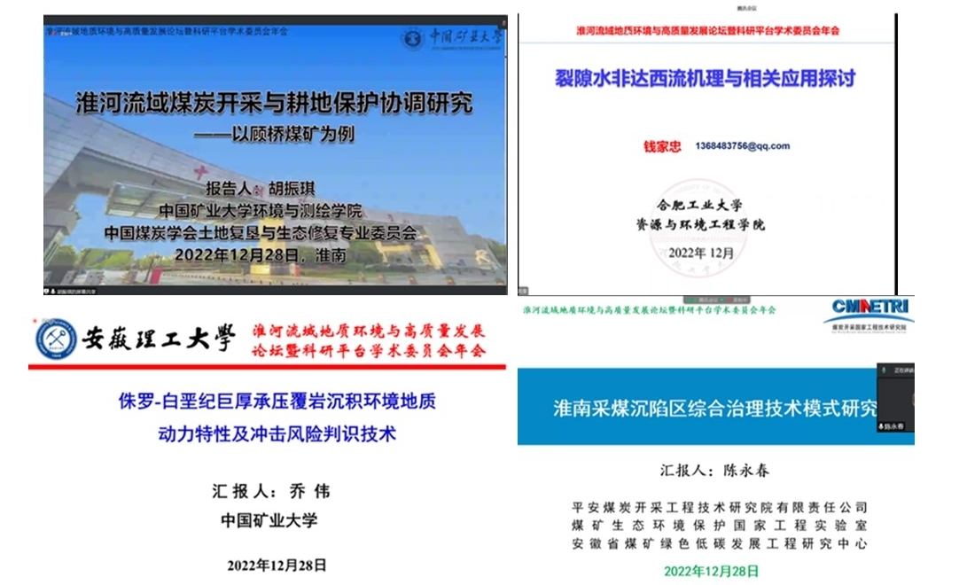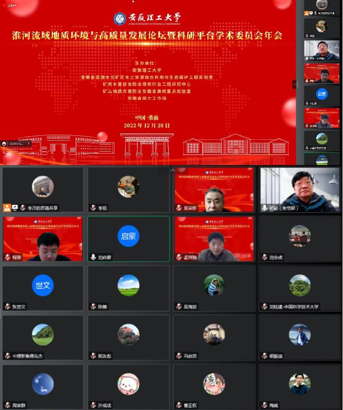 12月28日,淮河流域地质环境与高质量发展论坛暨科研平台学术委员会年会隆重举行。本次会议采用线上视频的方式,由安徽理工大学、安徽省高潜水位矿区水土资源综合利用与生态保护工程实验室、矿井水害综合防治煤炭行业工程研究中心、矿山地质灾害防治安徽省高校重点实验室以及安徽省院士工作站共同主办。安徽理工大学副校长孟祥瑞、大国工匠朱恒银教授,科研部、地球与环境学院有关负责人以及学院各科研平台学术委员会委员、执行负责人等近150人参加了会议。