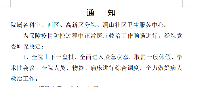 为了保障疫情防控过程中正常医疗救治工作顺畅进行,2023年1月1日,在元旦佳节之际,一附院党委再次做出重要部署,要求全院上下一盘棋,全面进入紧急状态,取消一般休假、学术性会议,同时医院领导班子形成专班督导,减少择期手术数及常规住院病人治疗,加大住院病人床位周转率,对全院人员、物资、病床进行综合调度,全力做好病人救治工作。