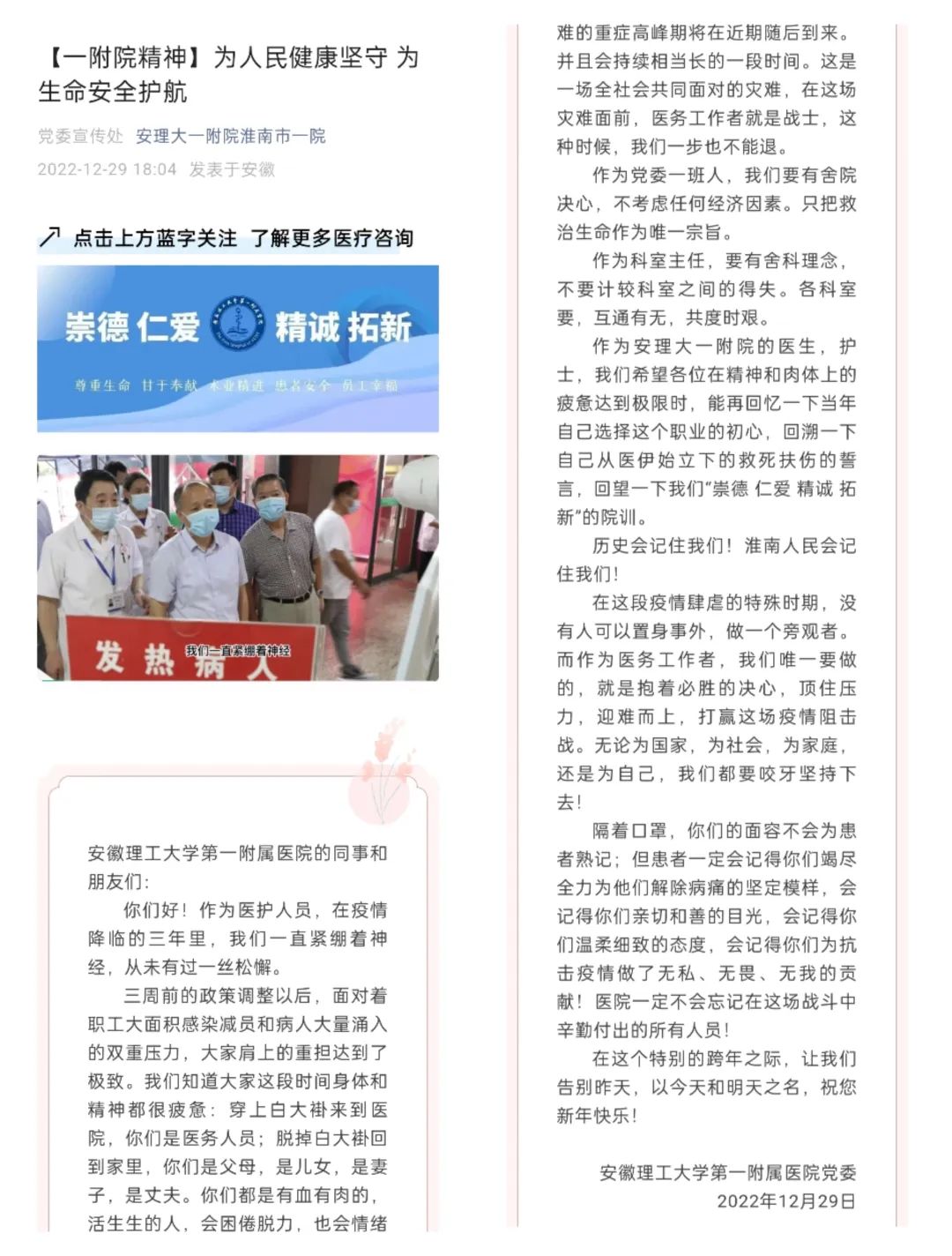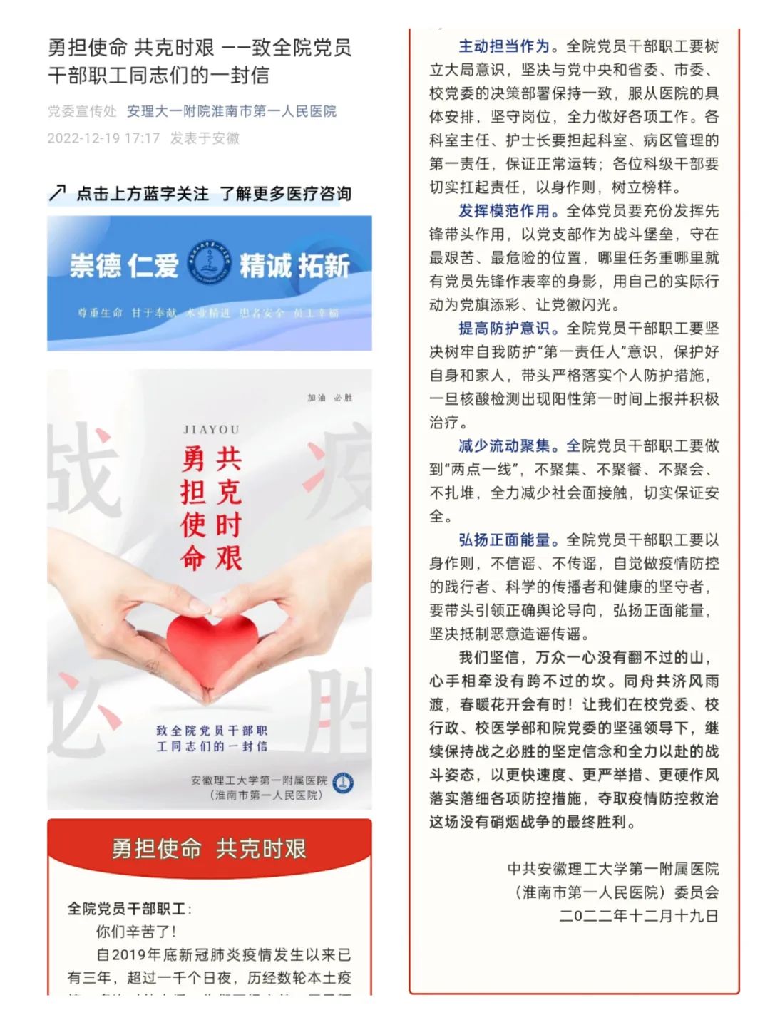 提振士气,鼓足勇气,全院一心筑牢生命的最后一道防线!12月19日一附院党委发出《致全院党员干部职工同志们的一封信》在全院职工的朋友圈不胫而走,给奋战一线的医护人员注入了一针强心剂。