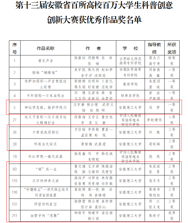 近日,由省科协、省教育厅、团省委主办的第十三届安徽省百所高校百万大学生科普创意创新大赛获奖名单公布。我校获一等奖1项、二等奖2项、三等奖4项、优秀奖1项,再次捧得大赛“优胜杯”(排名第一,全省四所高校获得),并获评优秀组织奖,获奖作品数量居安徽省首位。