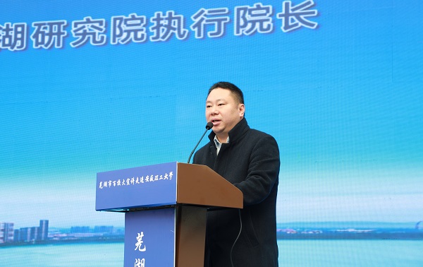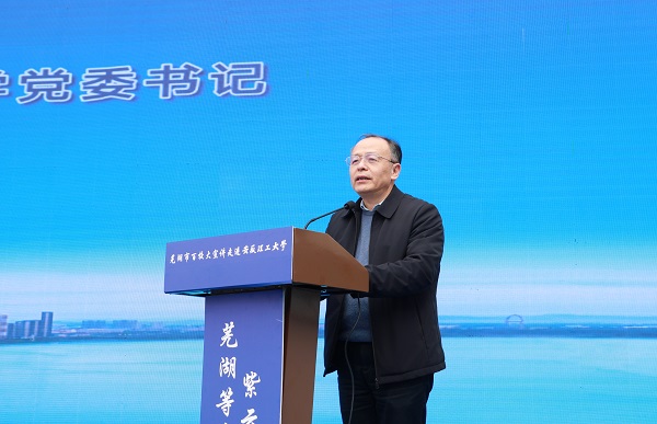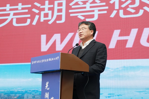郭永存在致辞中向长期以来关心支持学校建设发展的芜湖市各级领导以及社会各界表示衷心的感谢。他从历史沿革、学科建设、人才培养、科技创新以及以“双一流”创建为引领,深入实施“四个融入”战略等方面介绍了学校近年取得的成绩。他指出:市校携手开展“芜湖市2023全国百所高校大宣讲走进我校”活动,是贯彻落实党的二十大精神,践行“人才是第一资源”的务实举措,也是落实省委郑栅洁书记“真心爱才 悉心育才 倾心引才 精心用才”要求的具体行动。芜湖区位优势突出,产业链条舒展,是合肥、南京两大都市圈的“双核城市”。这几年,芜湖在全省率先出台“创业芜优”“紫云英人才计划”等政策,成立安徽省首家人才发展集团,创新实施“畅聊早餐会”等,爱才敬才名片越擦越亮,引才聚才磁场越来越强,育才用才环境越来越好,深受“点赞”“好评”。他回顾了学校与芜湖市合作的具体举措和在政产学研等方面取得的成果,并表示将进一步加大芜湖市人才政策宣讲力度,助推更多毕业生去芜湖就业创业,为芜湖加快打造省域副中心城市提供坚强的人才和智力支撑。