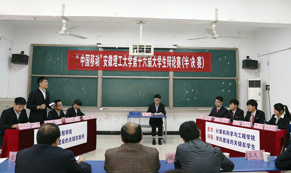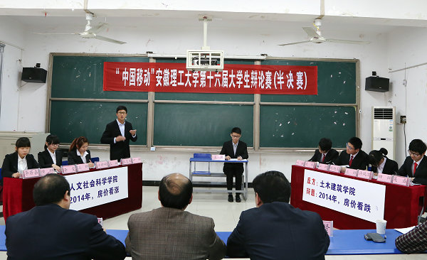 3月30日下午,安徽理工大学第十六届大学生辩论赛半决赛两场比赛在北校区理学院2楼报告厅举行。经过初赛、复赛两轮比拼胜出的机械工程学院和计算机科学与工程学院,人文社会科学学院和土木建筑学院4支辩论队分别围绕“学风建设的关键在于老师还是学生”、“2014年,房价看跌还是看涨”这两个辩题展开了精彩激烈的辩论。