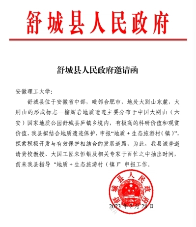 受舒城县人民政府邀请,3月2日至3日,“大国工匠”朱恒银教授一行赴六安市舒城县调研指导中国地质文化村申报工作,受到了舒城县委常委、副县长薛潇,副县长詹汪林校友的热情接待。