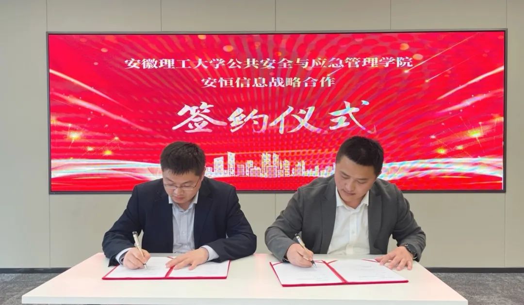 签约现场,公共安全与应急管理学院院长顾成杰,安恒信息副总裁、数字人才创研院副院长吴鸣旦代表双方签署战略合作协议书。安恒信息安徽办主任唐路等出席签约仪式。