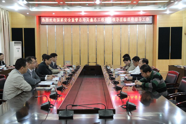 4月11日上午,国家安全生产监督管理总局总工程师吴鑫,安徽煤矿安全监察局党组书记、局长卜庆林,安徽省安全生产监督管理局局长张海阁,安徽煤矿安全监察局副局长周德昶,淮南市副市长官山月等一行到校调研访问。校党委书记颜事龙、校长郭永存代表学校热情接待了吴鑫一行,双方在图书馆北会议室进行了交流座谈。